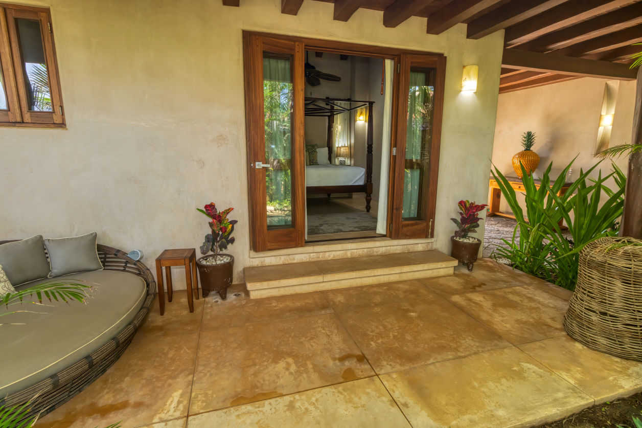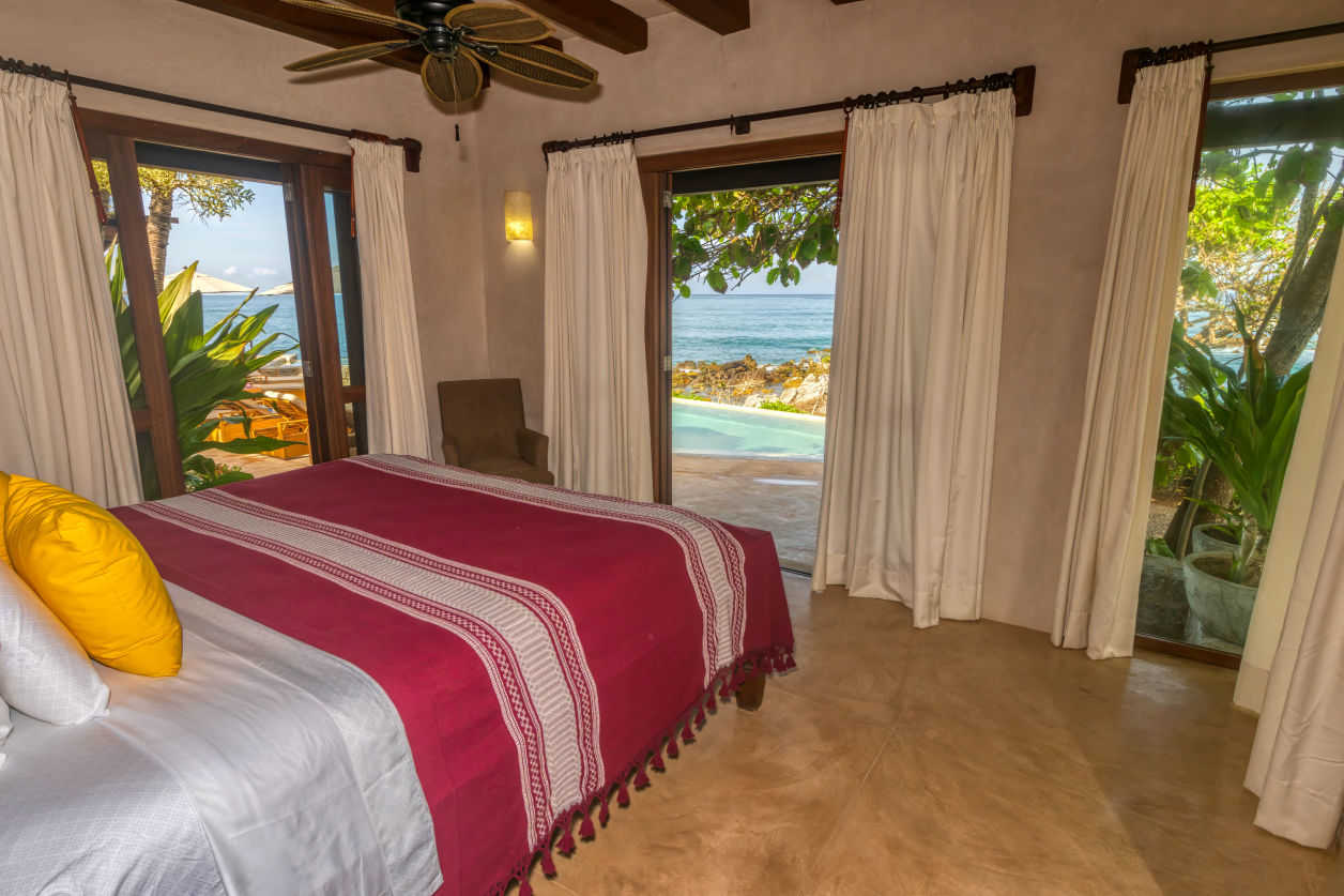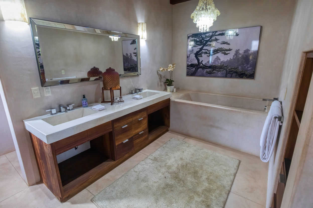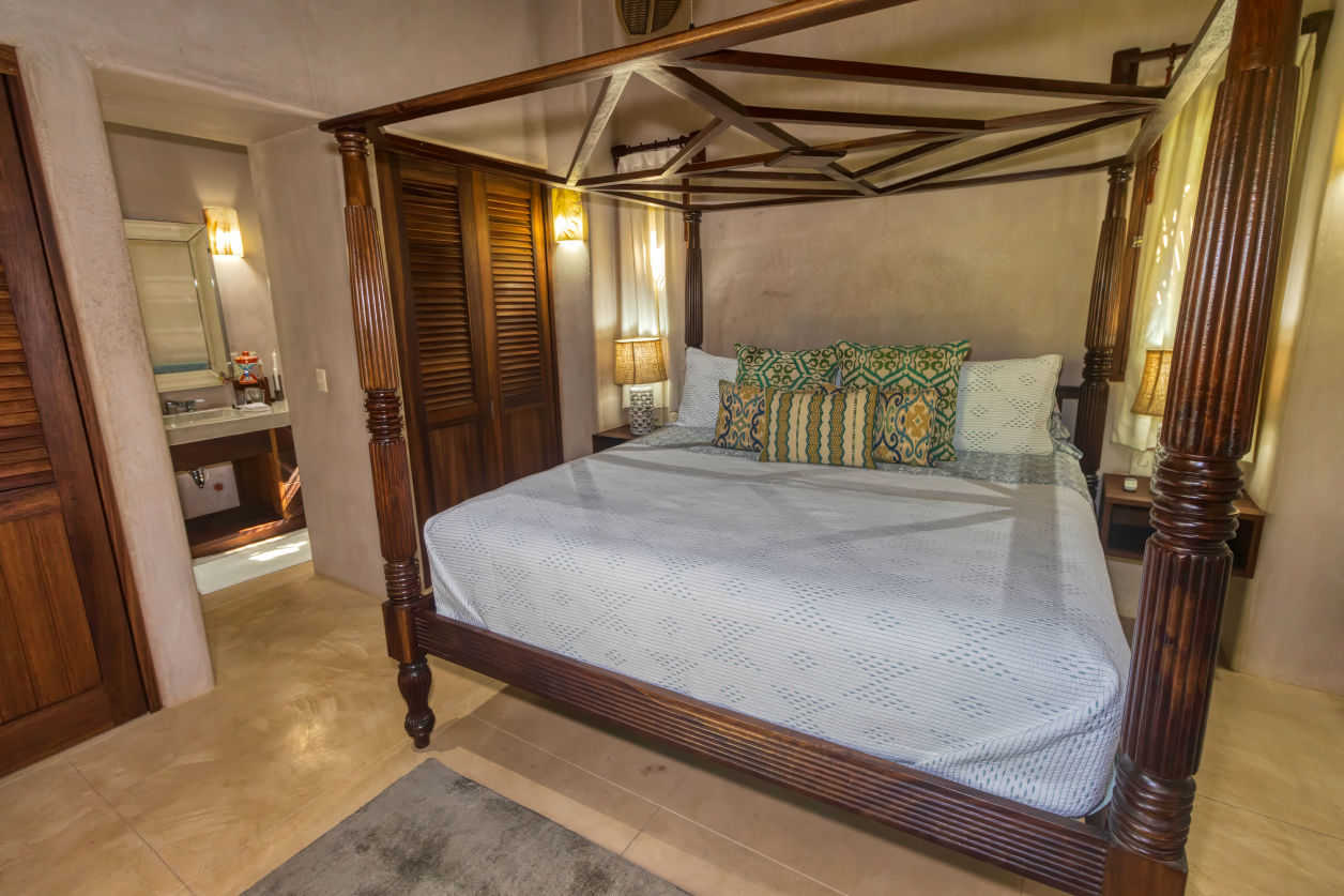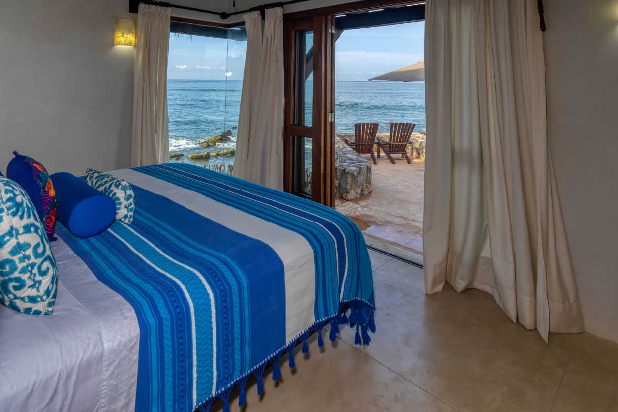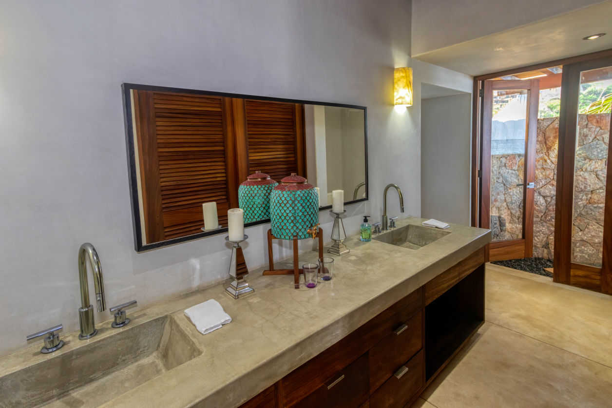 Two ocean-front king-size master suites with breathtaking views and large doors that open to allow the breezes are at the front of the villa. Each has an expansive bathroom, with outdoor showers.