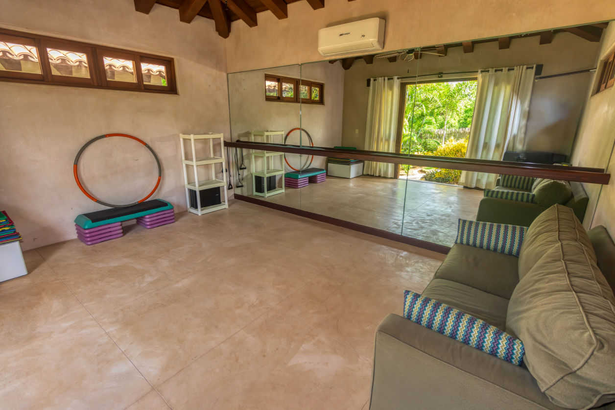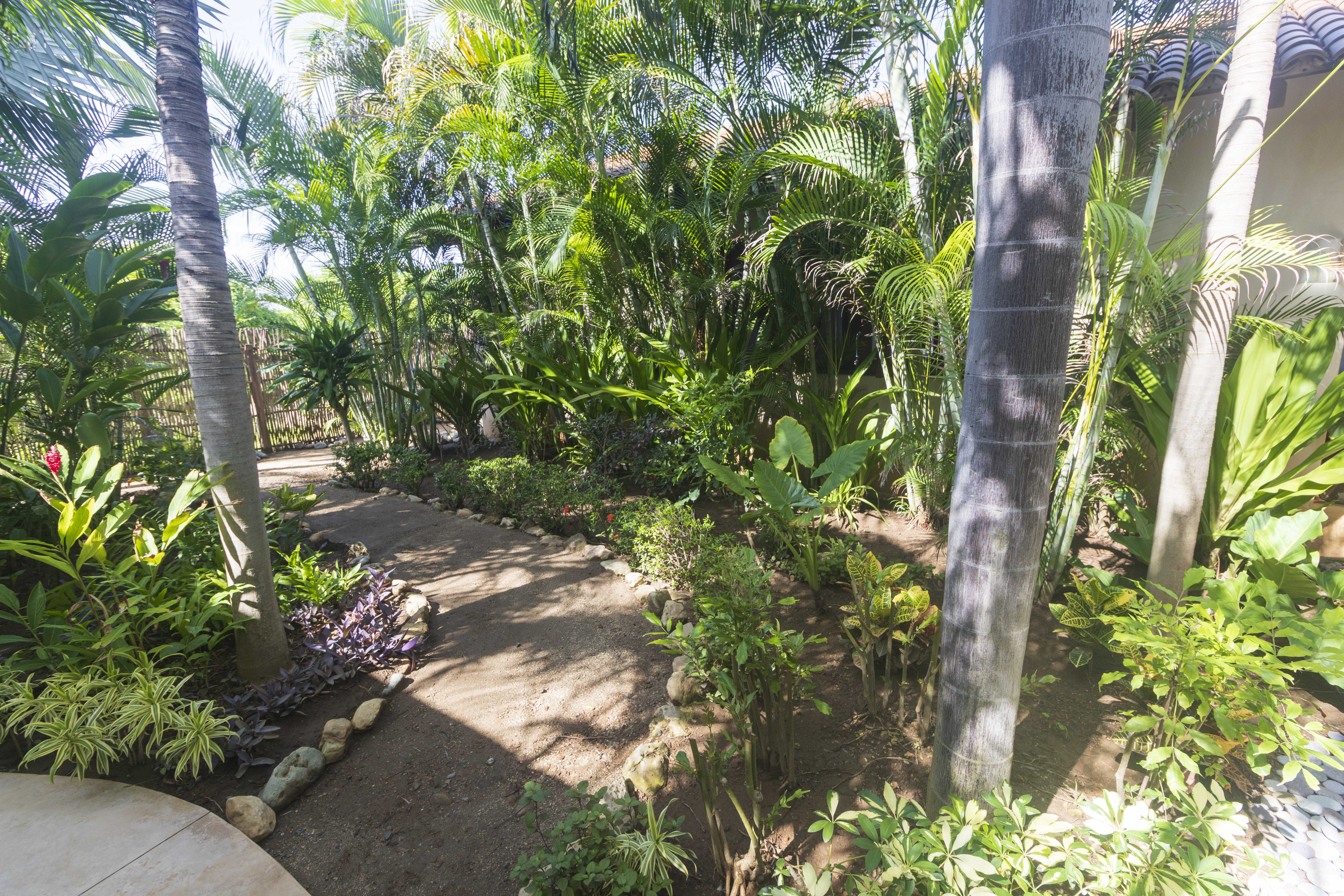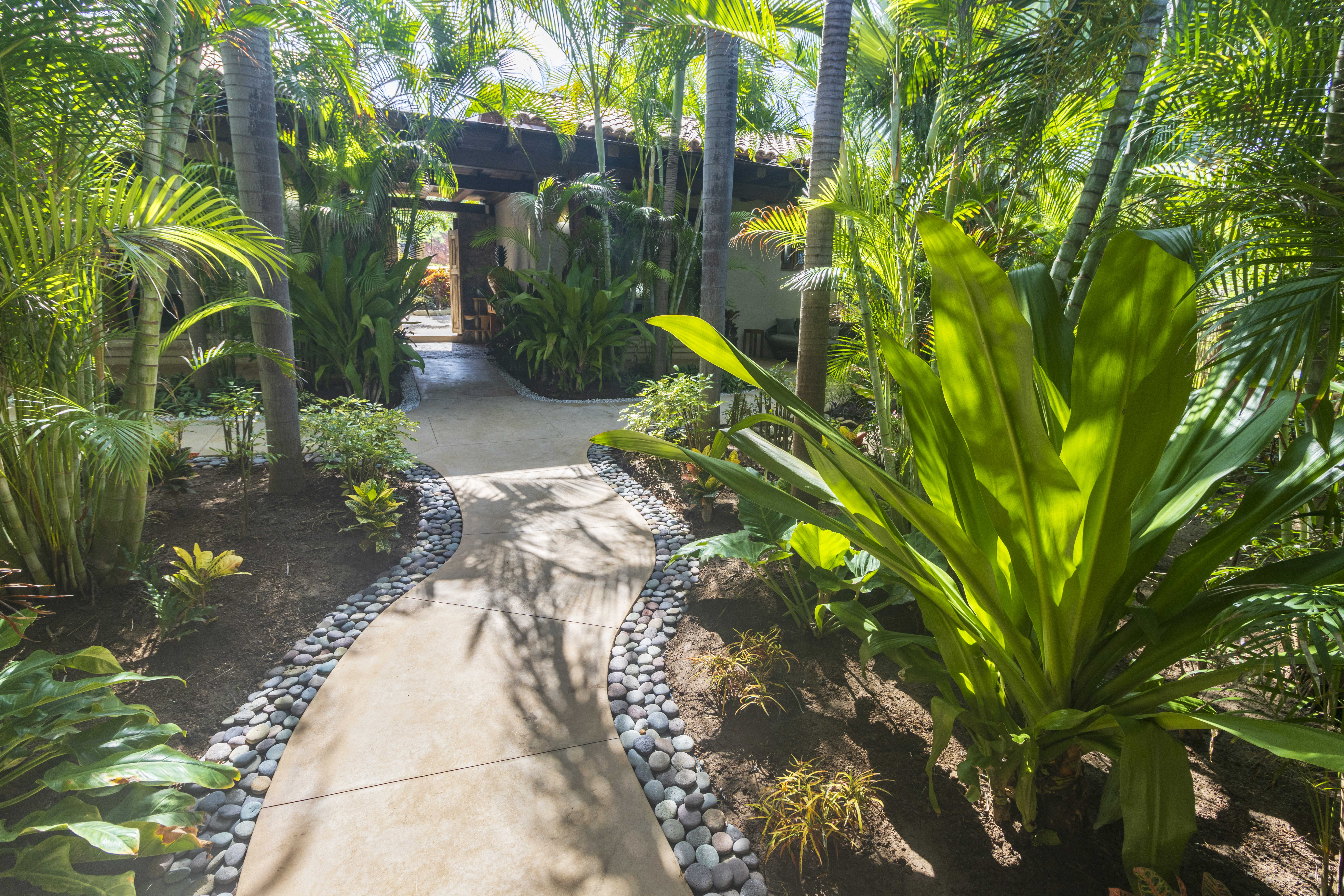 The lush gardens hold three bungalows. Two of them private suites with full baths and the other a fitness room.