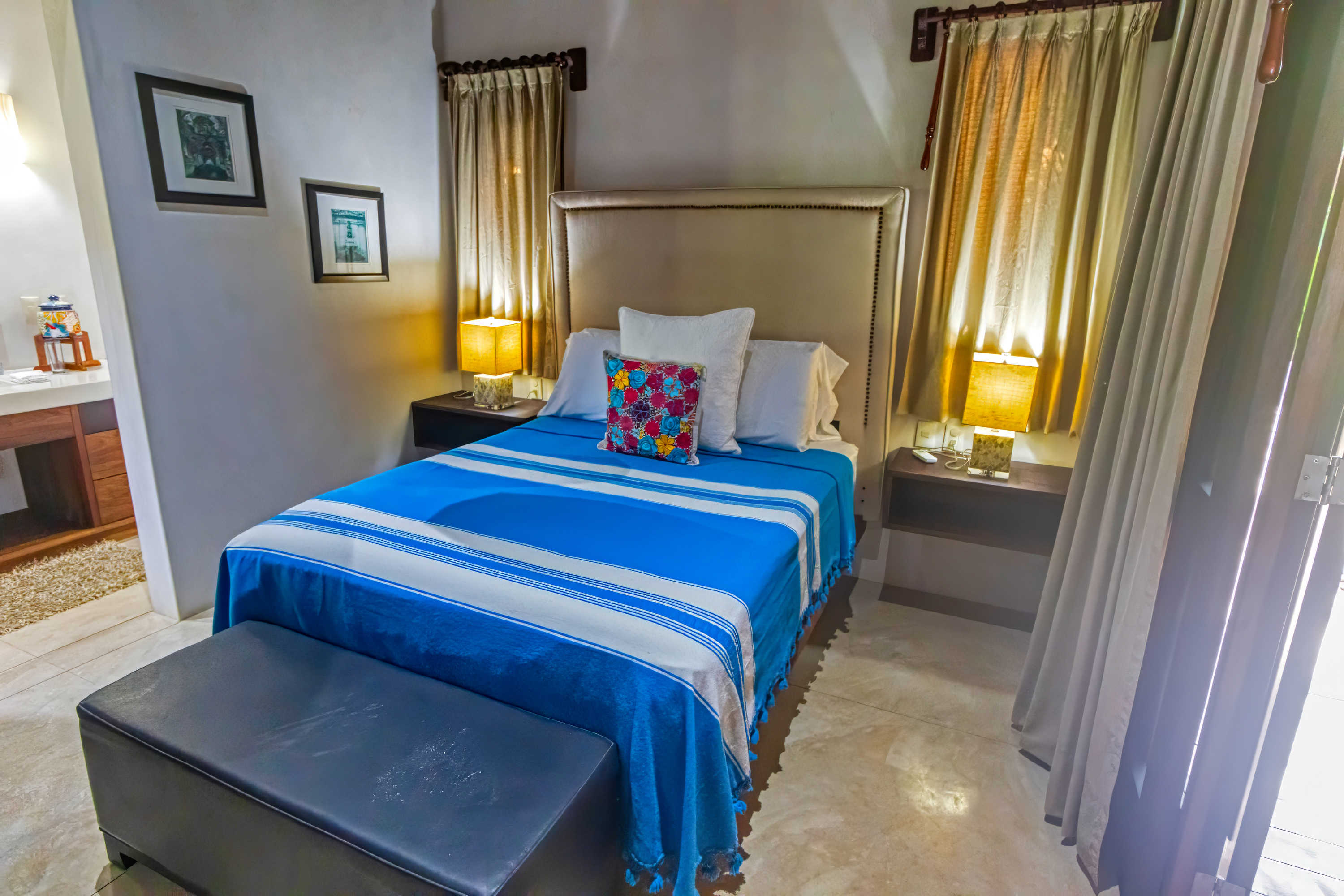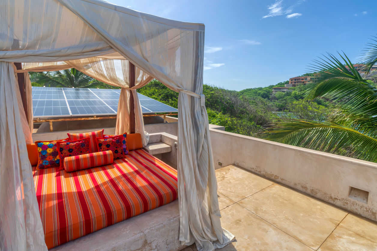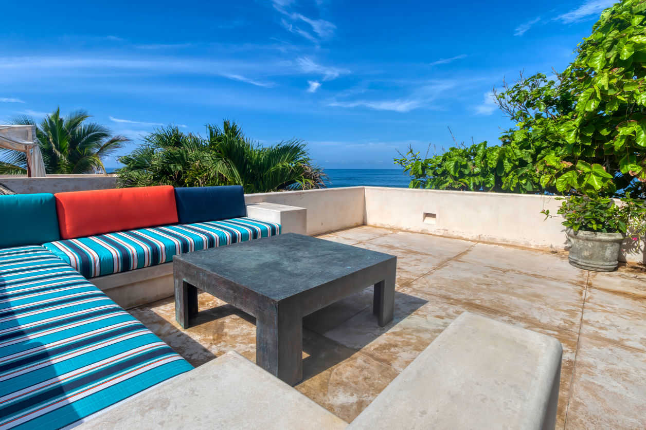 Stairs to the left and right of the main villa lead up to two open air terraces with commanding views of the surrounding ocean, mountains and town. One features a seating area, perfect for sunset cocktails and time with good friends. The other, a canopy bed... afternoon naps or enjoying you favorite book cooled by the ocean breeze.