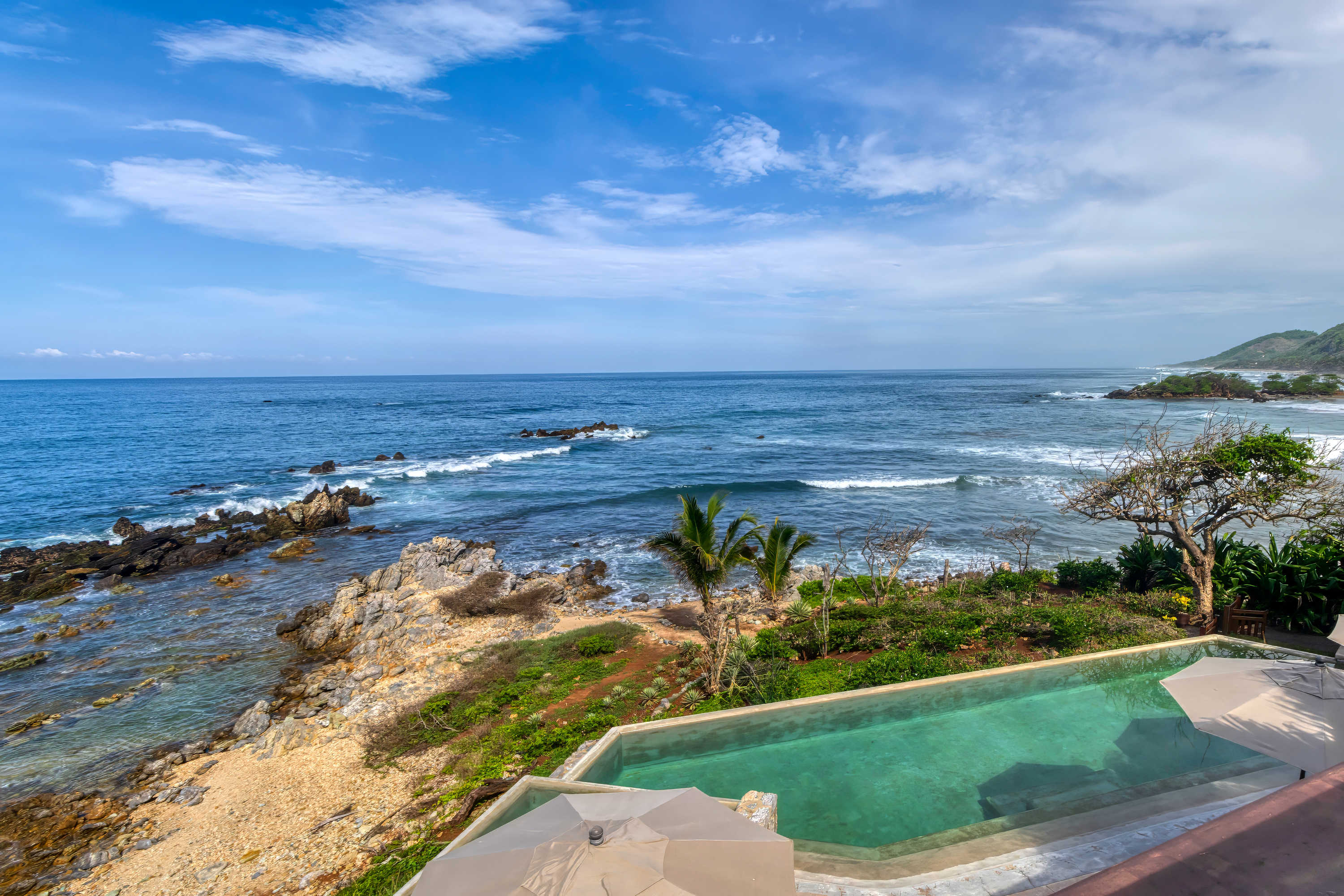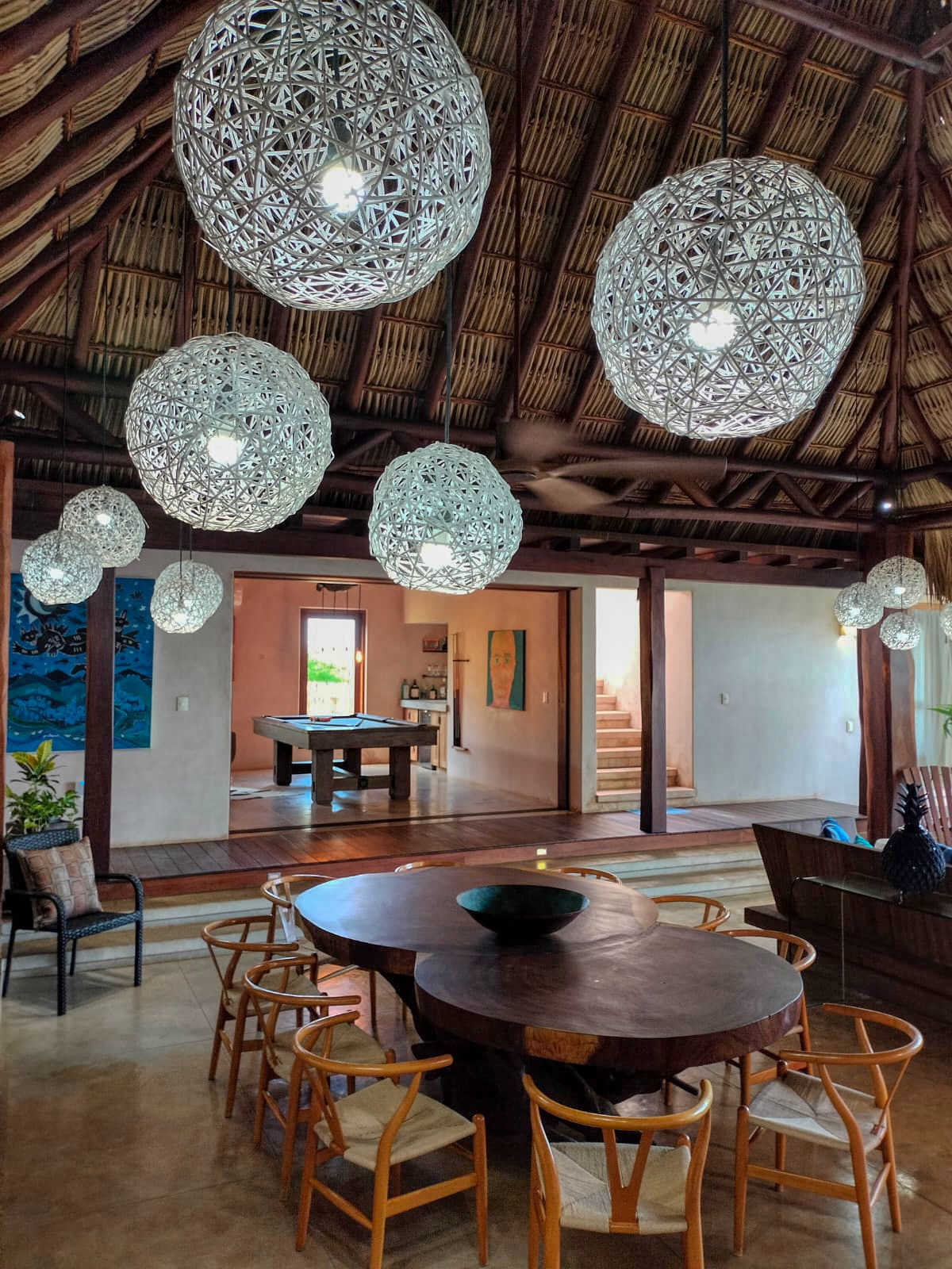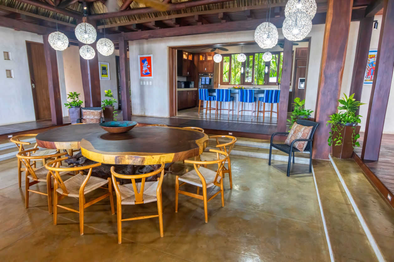 The main building of the villa features a large central seating and dining area facing the pool and ocean. The high vaulted ceiling and beautiful lighting transport you to a different place and time. Ocean breezes enter through the open air entrance and at night the sound of the waves are... well, enchanting.